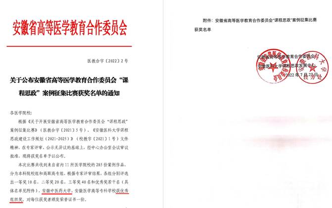 近日,我校在安徽省高等医学教育合作委员会主办的“课程思政”案例征集比赛中获得佳绩。