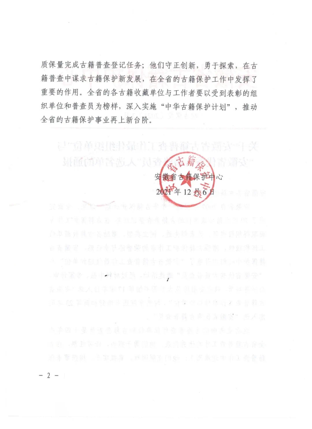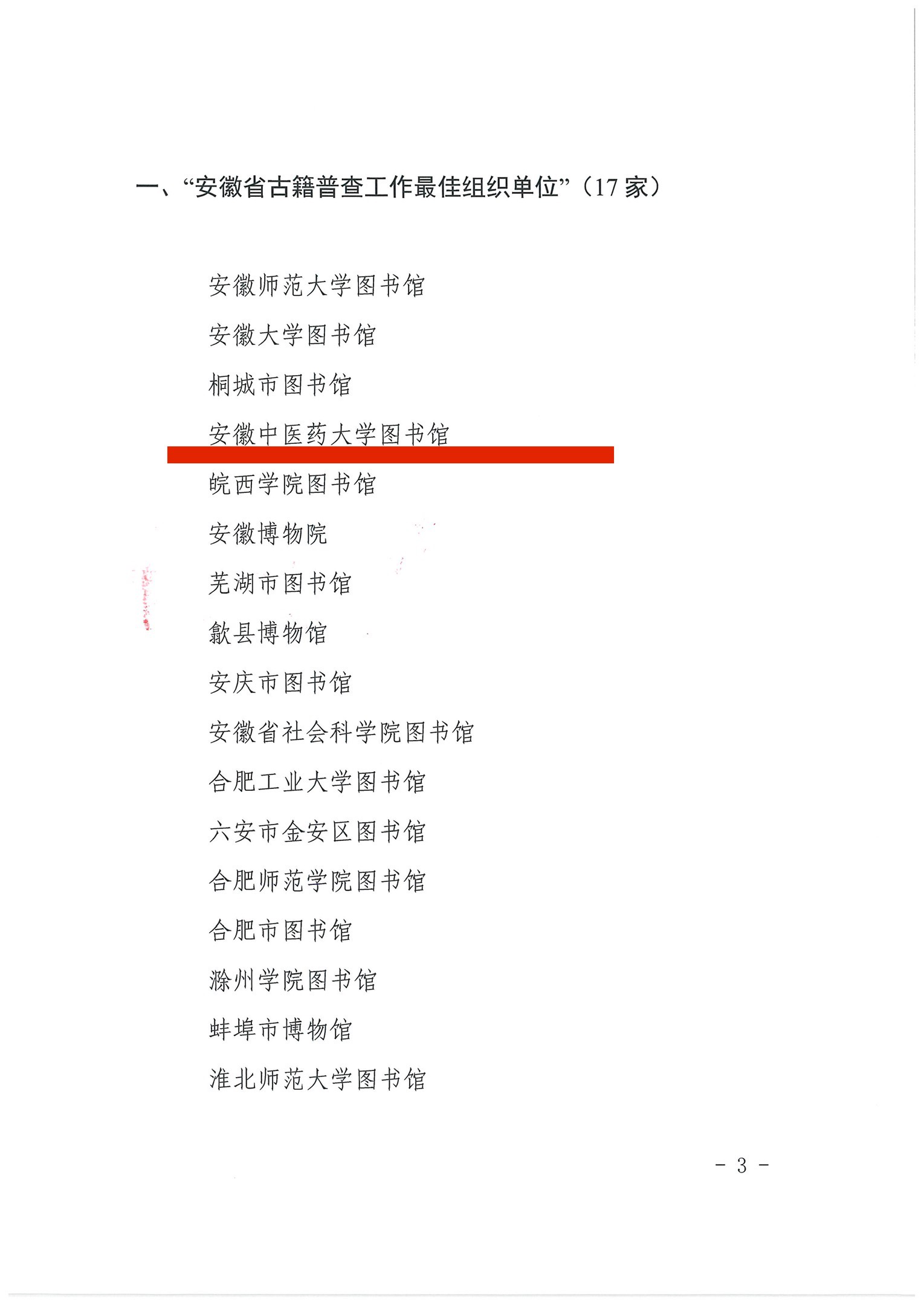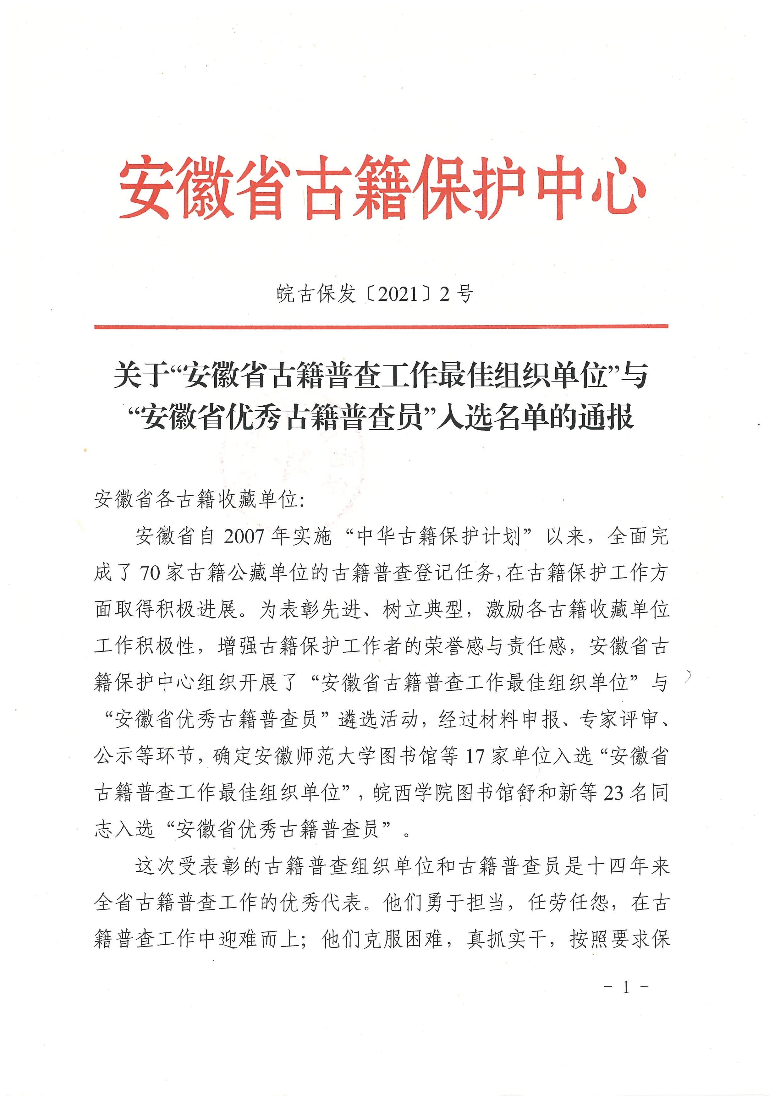 日前,安徽省古籍保护中心组织开展“安徽省古籍普查工作最佳组织单位”与“安徽省优秀古籍普查员”遴选活动,经过材料申报、专家评审、公示等环节,最终,我校图书馆成功入选“安徽省古籍普查工作最佳组织单位”,邓勇、卢虹宇两位同志入选“安徽省优秀古籍普查员”。