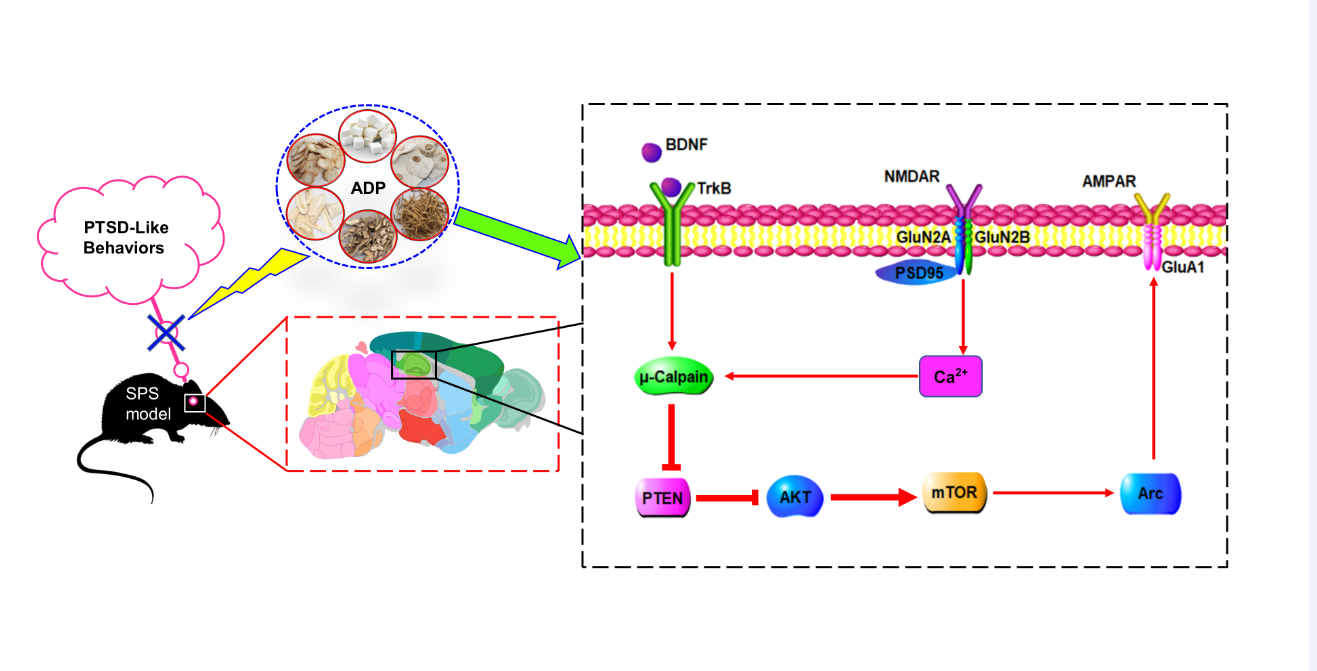 安神定志方是新安医学古籍《医学心悟》记载方,临床常用此方治疗惊恐障碍、抑郁和失眠等疾病。科研团队通过建立SPS模型,探究了安神定志方治疗PTSD的作用机制。该研究首先对安神定志方中的药效成分(人参皂苷Rg1、人参皂苷Rb1、茯苓新酸B、细叶远志皂苷、α-细辛醚和游离钙)进行表征,药理实验发现,安神定志方改善SPS模型的PTSD样行为可能通过mTOR依赖的海马突触功能介导(https://www.sciencedirect.com/science/article/pii/S0944711322002185?via%3Dihub)。